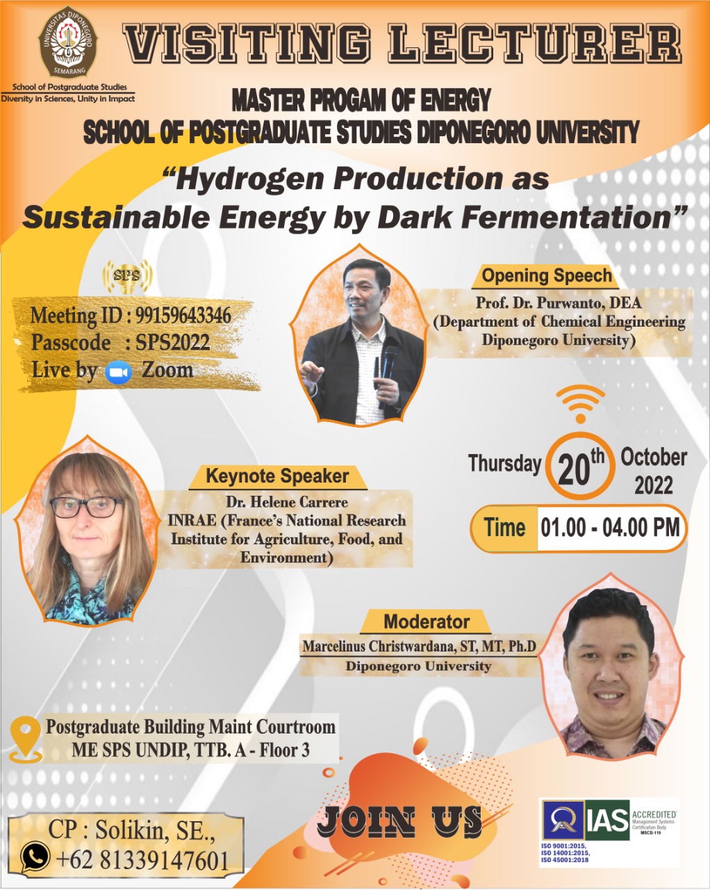 Magister Energi Universitas Diponegoro mengadakan kegiatan Visiting Lecturer dengan tema “Hydrogen Production as Sustainable Energy by Dark Fermentation” pada Hari Kamis tanggal 20 Oktober 2022 pukul 13.00-16.00 WIB.